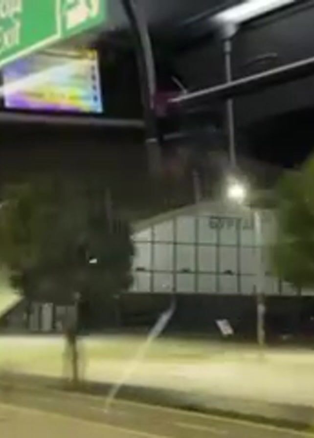 The view from inside a bus at night shows the Burgas airport terminal through the window