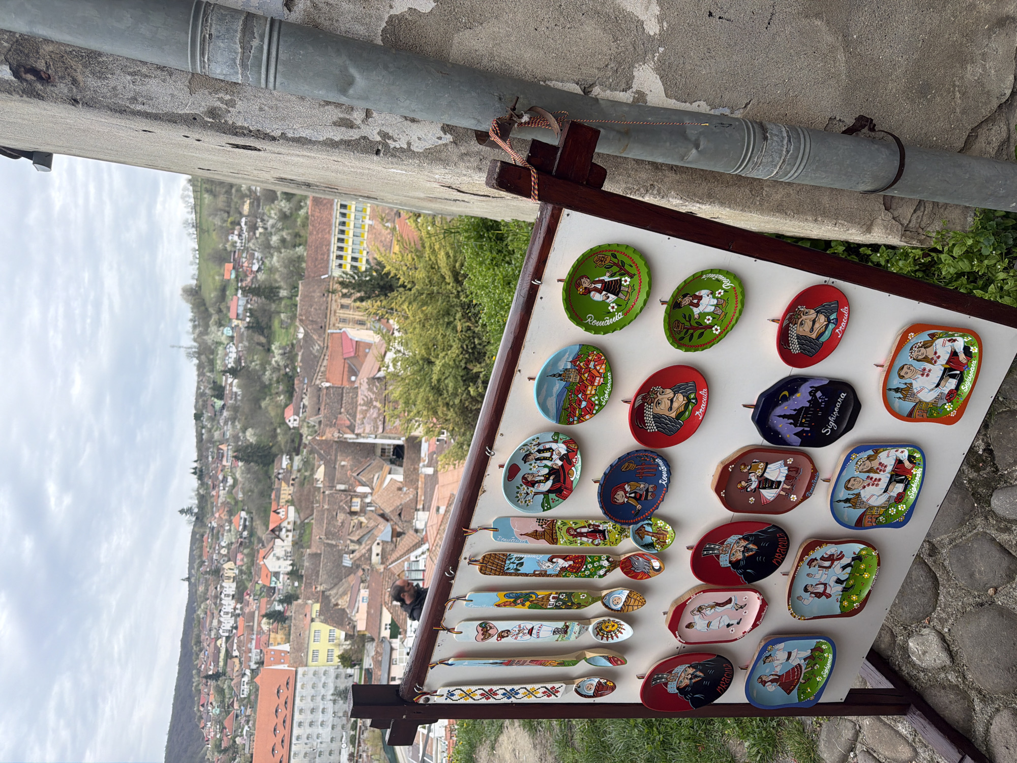 display of painted decorative plates and spoons for sale in Sighișoara, Romania. The display is set up on a white board with a brown wooden frame. The plates depict scenes from Romanian culture, including folklore, historical figures like Vlad the Impaler (Dracula), and traditional costumes. The spoons are similarly decorated. The display is positioned outdoors, next to a stone wall with a metal pipe running along it. In the background, a cityscape with red-tiled roofs stretches towards a cloudy sky. The town is likely Sighișoara, as indicated by the subject matter of the souvenirs. A partial view of a person is visible to the left of the display. Cobblestone ground is located next to the display.