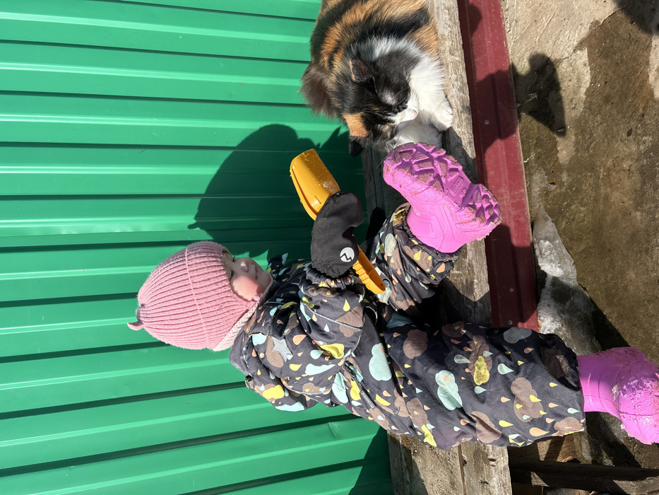A child and a cat are observed outdoors, sitting on a weathered wooden bench against a bright green corrugated metal fence. The exact location within Азинский, Russia, is not discernible from the image. The child, a toddler, is dressed in winter attire, including a pink knit hat, a multi-patterned dark winter suit, black gloves, and bright pink boots. The child holds a yellow plastic shovel in gloved hands and is looking towards the cat. To the right of the child, a calico-patterned domestic cat, primarily black, orange, and white, rests on the same wooden bench. Its eyes appear partially closed. Strong sunlight from the left illuminates the scene, casting distinct shadows on the green fence and the ground. The ground beneath the bench shows patches of melting snow or ice and exposed dirt/concrete.