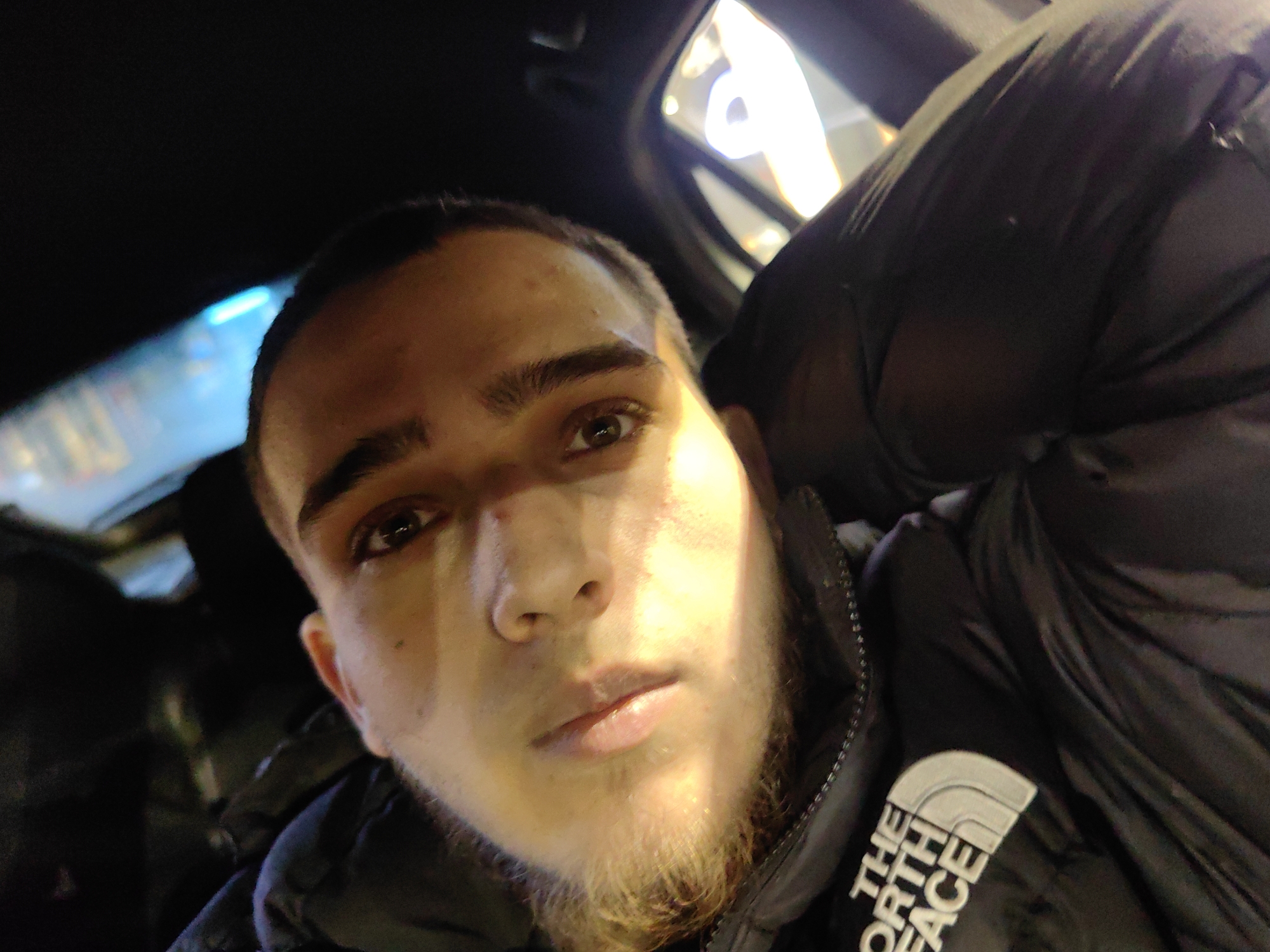 A selfie taken from a low angle shows a person in the interior of a vehicle. The person is a young male with short dark hair, a light beard, and light skin. He is wearing a black puffy jacket with "The North Face" logo visible on the right side of the jacket. The vehicle's interior appears dark with some light reflection off of the glass. The location cannot be determined to be Sofia, Bulgaria, based solely on this image.