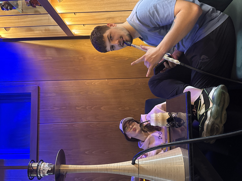 Two young adults are seated at a table in BlackOut Shisha Bar Sofia, located at ul