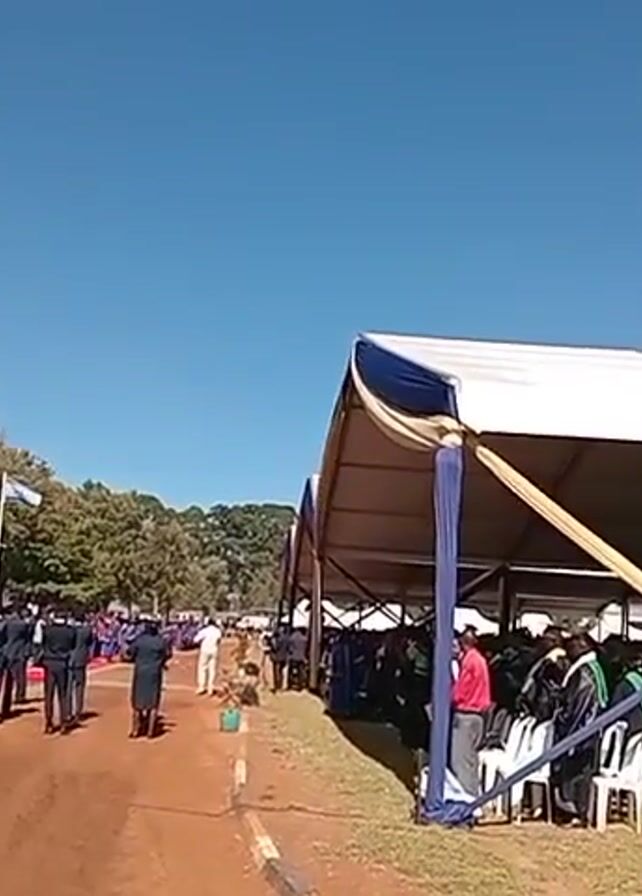 n outdoor graduation ceremony. There is a large white tent structure on the right, filled with people wearing graduation gowns and seated in rows of white chairs. The tent is decorated with blue, gold, and white fabric. On the left, a line of people in blue uniforms stands at attention near a building labeled "Pavilion." A Kenyan flag flies in the background. The ground is a reddish-brown dirt. The sky is clear and blue. The camera appears to be handheld and is being held by someone in the crowd. The focus shifts upward towards the tent roof. People are milling around in the open space between the uniformed individuals and the tent.