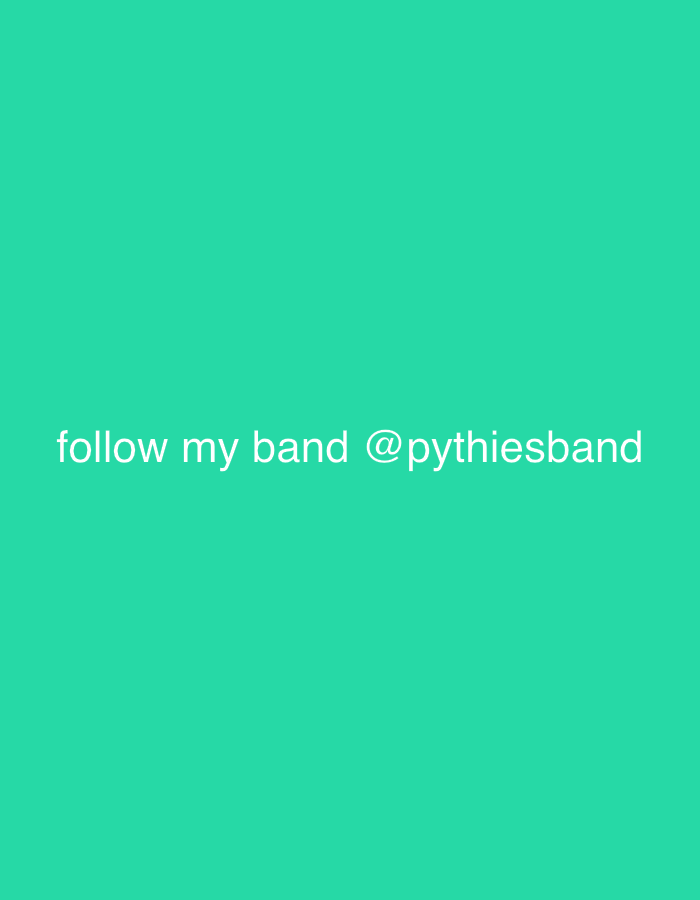 The image displays a solid teal-green background. Centered horizontally on this background is white text that reads "follow my band @pythiesband". No discernible physical environment, people, objects, actions, or specific geographical location within the city of Paris, France, or anywhere else, are present in the image.