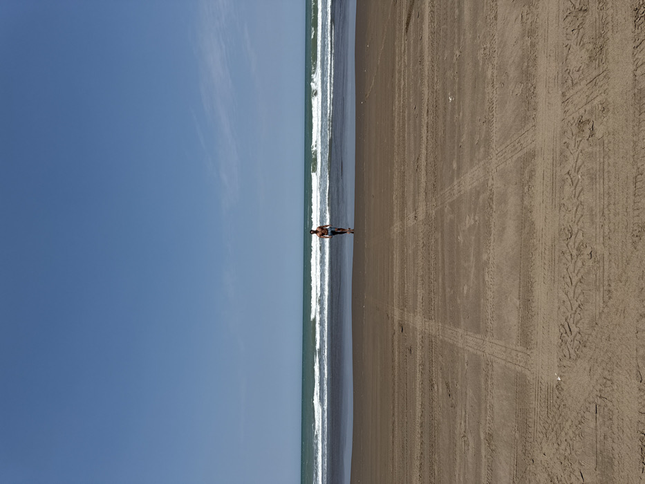 A horizontal view presents a wide sandy beach stretching to the right, marked with tire tracks. To the left, the clear blue sky occupies a significant portion of the image. A strip of ocean separates the sky and beach, with waves gently breaking. In the middle of the ocean strip, a person stands in the water. The scene evokes a sense of vastness and tranquility.