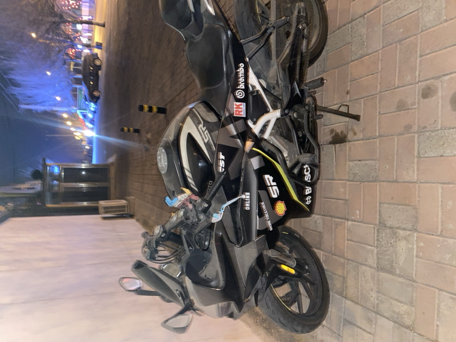 A black sport motorcycle is parked on a beige paver sidewalk at night in Zhongtun, China