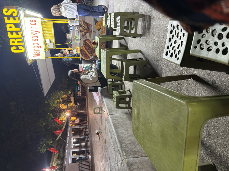 The image displays a nighttime outdoor scene in Nam Hoa Lư Ward, Vietnam. A yellow, illuminated street food cart with "CREPES" and "Mango stiky rice" signs is prominently featured. An arrangement of small, green plastic tables and stools occupies the paved area in front of the cart. A female individual in a light-colored jacket and dark pants sits at one of these tables, facing right. Behind the cart's counter, two people are actively engaged in food preparation. To the right of the cart, another person, wearing a white jacket and blue pants, stands with their back to the camera. In the middle ground, a small, white and brown dog lies leashed on the pavement. To the left, a white building with columns and metal railings is visible, adorned with several red Vietnamese flags. Trees in the background are illuminated by multiple hanging orange lanterns. A partial view of a person and additional green stools are visible in the immediate foreground, to the right.