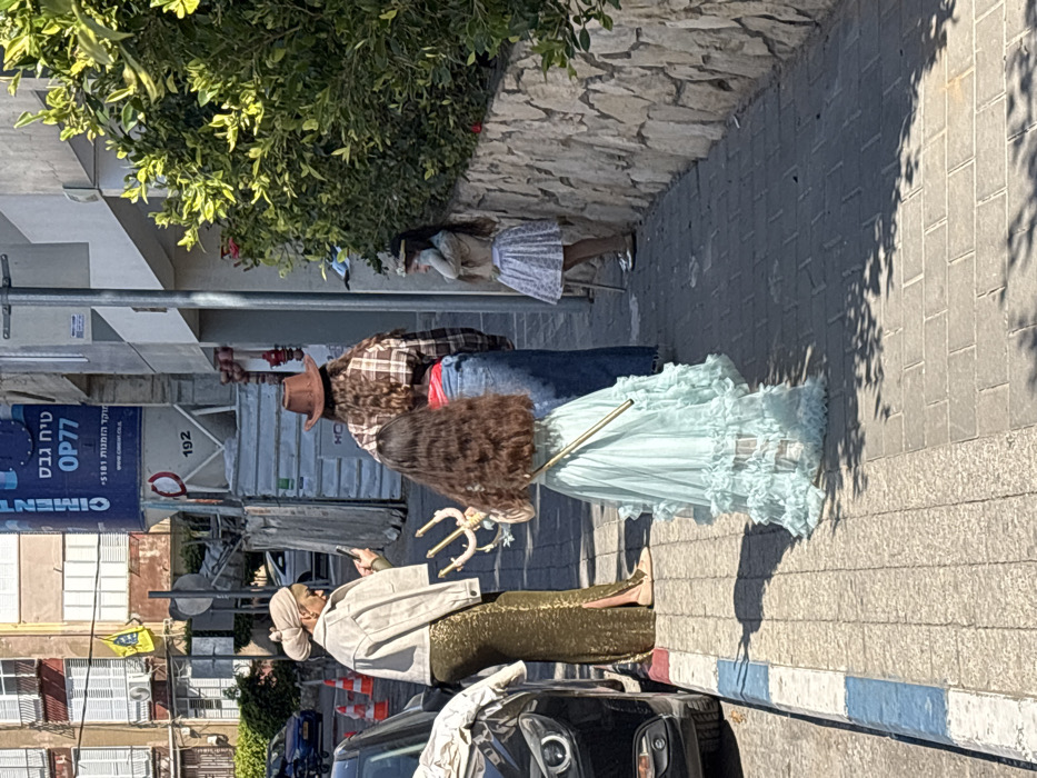 The scene depicts a sunny urban street in Bat Yam, Israel, with four individuals on a paved sidewalk. On the left, an adult female wearing a light-colored head covering, a beige jacket, and a long golden sequined skirt stands beside a black parked sedan, holding a silver smartphone. In front of her, a child, facing away, is dressed in a long, light teal ruffled gown, holding a gold-colored trident prop in her left hand and a gold-colored staff prop behind her back. Directly behind this child is an adult, also facing away, wearing a brown cowboy hat, a brown and red plaid shirt, and blue jeans. To the right, a second child stands near a stone wall with green foliage; she wears a light-colored top, a patterned skirt, a headband, and holds a thin stick. In the background, residential buildings are visible, including one with a large blue concrete silo marked "CIMENTOP77 OP77" and "192." Construction barriers and orange traffic cones are present in the street, which is bordered by a blue and white striped curb. Strong sunlight creates distinct shadows on the grey paver sidewalk.