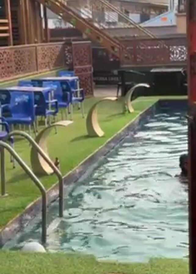 The camera shows a swimming pool surrounded by artificial turf