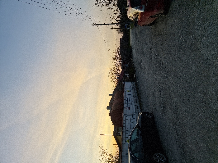 The image portrays an unpaved, gravel road in Balgarevo, Bulgaria, at dusk or sunset. The sky exhibits a color gradient from orange and yellow hues near the horizon to a pale blue overhead, with subtle, wispy cloud formations. On the left side of the gravel road, a black sedan is partially visible, parked adjacent to a low white cinder block wall featuring dark graffiti-like patterns. Behind this wall, a yellow building and a prominent, large reddish-brown cylindrical tank or container are silhouetted against the sky. The rear section of a red hatchback or wagon is visible on the right side of the gravel road. Further right, a wooden utility pole supports multiple power lines that extend diagonally upwards, with numerous small, dark birds perched along them. In the background, several silhouetted buildings with varied rooflines and bare trees are visible. No individuals are present, and no actions are occurring within the scene.