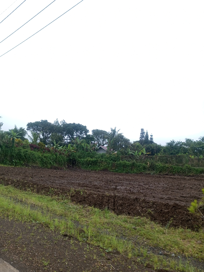 A rural scene under a cloudy sky. A freshly plowed field of dark brown soil dominates the foreground, bordered by a strip of green grass. Beyond the field, dense vegetation with various trees and shrubs lines the horizon. A glimpse of a building with a red roof is visible through the trees. Power lines stretch across the top left of the frame. The overall atmosphere suggests a remote, agricultural setting.