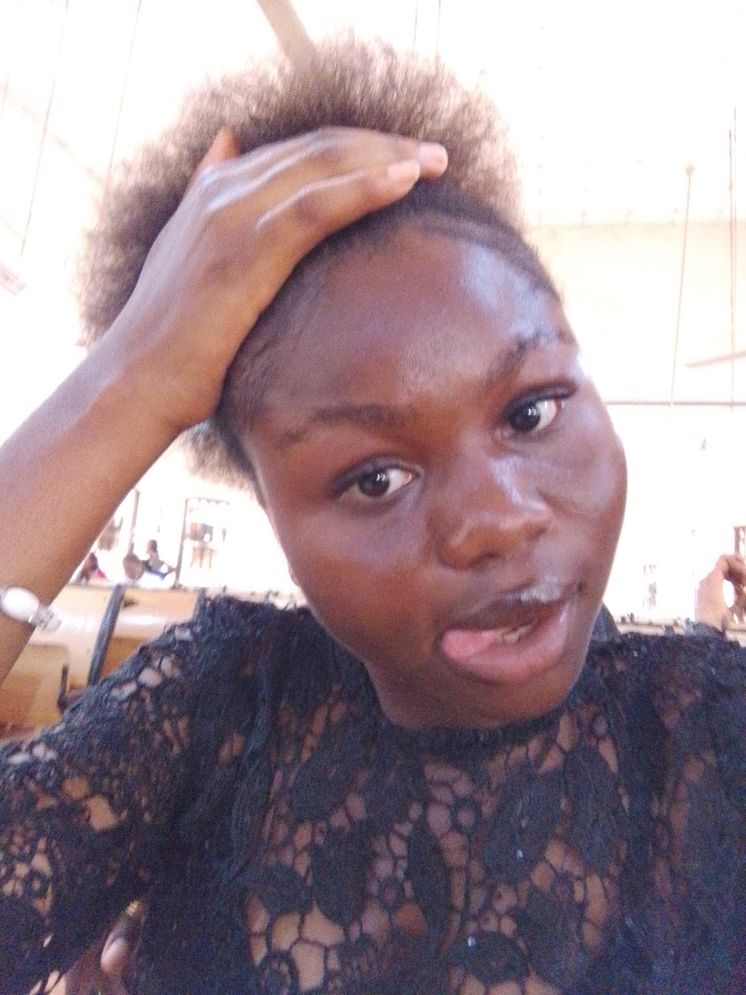 A dark-skinned female subject, with short, dark, curly hair, is centered in a brightly lit indoor photograph, looking directly at the camera. Her right hand is positioned with fingers touching the top of her head. Her tongue is partially extended from her mouth. She wears a black, open-patterned or lace top and a light-colored, possibly beaded, bracelet on her left wrist. The background is out of focus, revealing light-toned walls or ceiling, and faint, blurred outlines of other individuals and furniture consistent with desks or tables. A portion of a ceiling fan is visible in the upper right. Based on these environmental cues and the specified city, the scene is situated within an academic facility, such as the University of Nigeria, Nsukka, Nigeria.