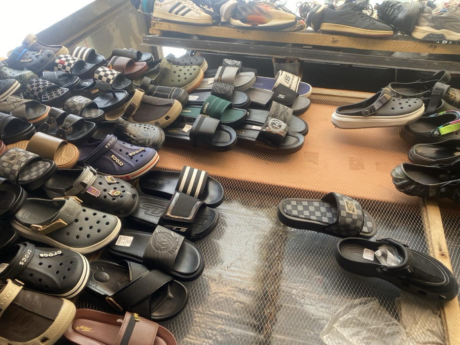 The image depicts a densely packed market stall showcasing various types of footwear in Jos, Nigeria