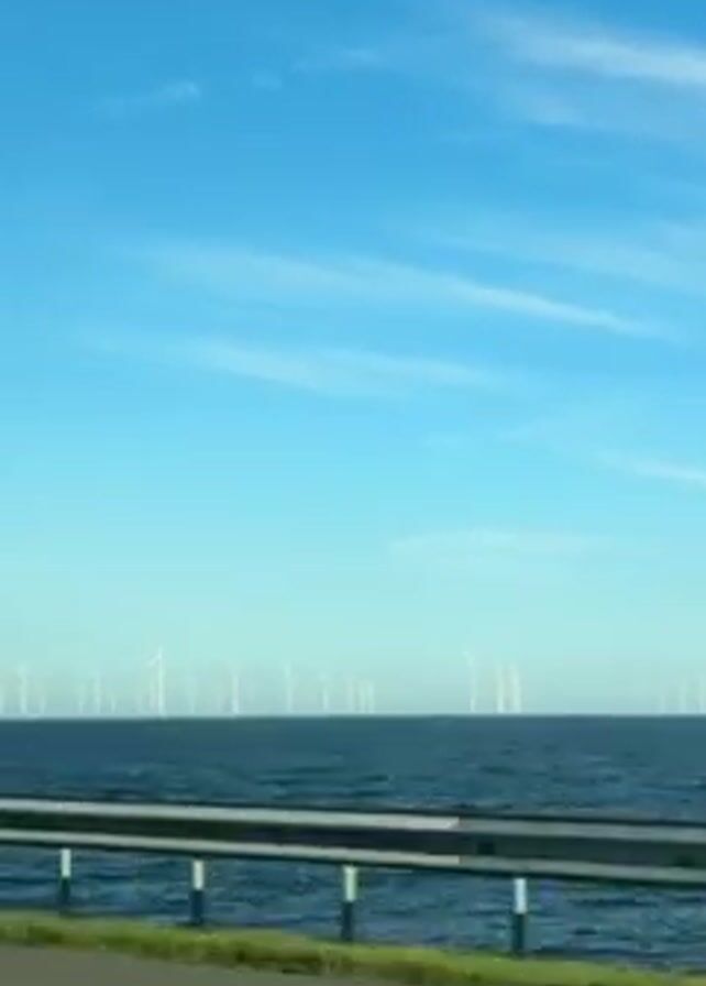 view from a moving vehicle, looking out over a body of water with a wind farm. The sky is blue with thin, wispy clouds. A metal guardrail runs along the edge of the road beside the water. Many wind turbines are visible in the distance, standing in the water. The road is asphalt, and a strip of green grass is visible between the road and the guardrail. The camera is stable.
