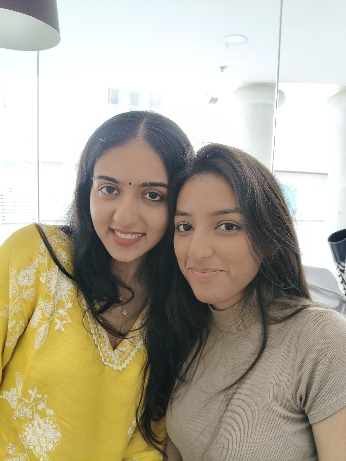 Two young women pose closely together. The woman on the left wears a vibrant yellow top with white floral embroidery and a delicate necklace. She has a dark bindi on her forehead. The woman on the right wears a beige, short-sleeved turtleneck. Both have dark hair and soft smiles. The background is bright, suggesting a well-lit indoor space with minimalist decor including a ceiling light and a pillar.