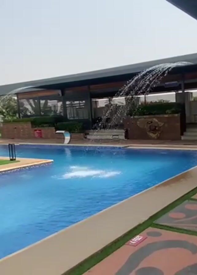 n outdoor swimming pool with blue tiles and clear water. A fountain feature in the pool sprays water into the air, creating a gentle arc. The pool is surrounded by a deck with patterned tile and artificial turf. A building with a covered patio is visible in the background, with chairs and tables on the patio. The sky is overcast.