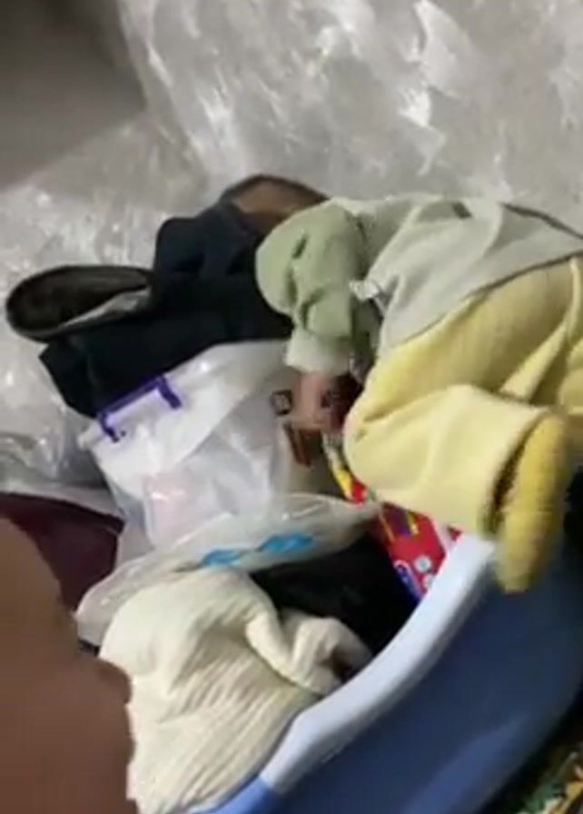 The video begins with a close-up shot of a baby lying among clothes and plastic bags in a light blue basin, surrounded by more clothes