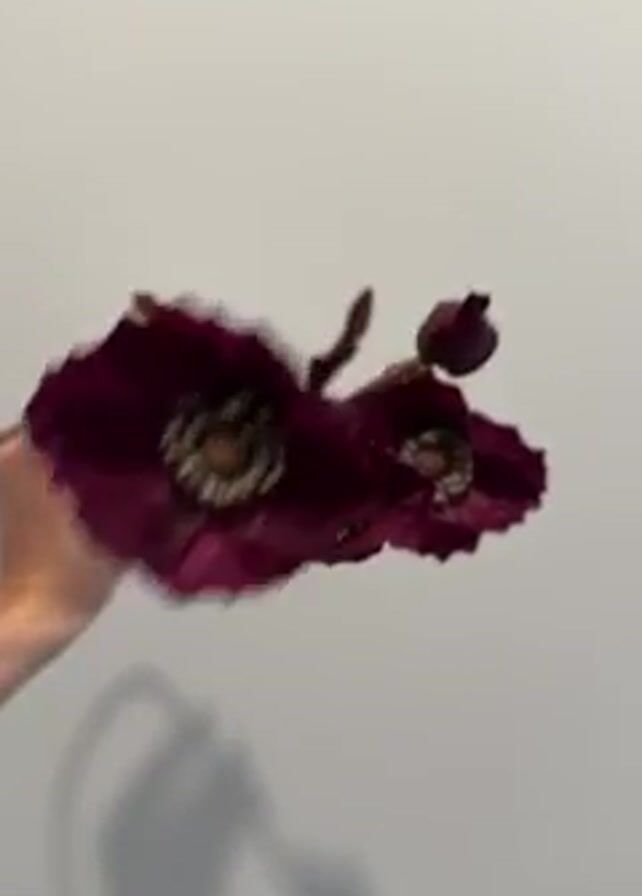 A fair-skinned hand holds a stem with three burgundy-colored anemone flowers and one bud against a light gray wall