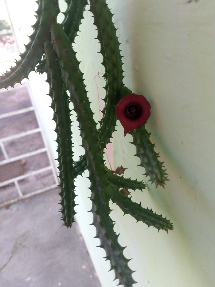 A succulent plant with ridged, spiky stems is shown indoors, leaning against a pale wall. A deep red flower, almost maroon, blooms from one of the stems. Small, unopened buds are also visible. In the blurred background, a brick surface can be seen. The overall impression is one of a unique and intriguing plant with a striking flower against a simple backdrop.