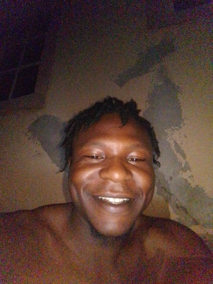 A smiling dark-skinned individual with short dreadlocks fills the frame. Their shoulders are visible at the bottom, suggesting a selfie perspective. The background is a wall with mottled textures and varying shades of light and dark, possibly indicating a room lit with dim lighting. A dark, shadowy area is visible in the top left corner, possibly the edge of a window or ceiling. The person's face is expressive, with visible teeth and a wide, cheerful smile.