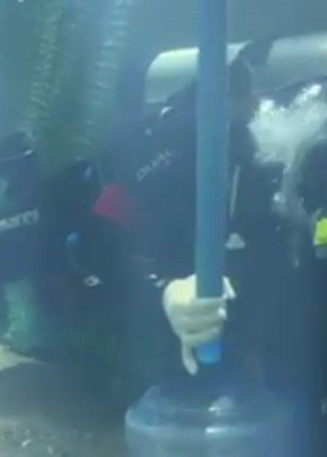 A scuba diver wearing a black wetsuit, yellow goggles, and white gloves is submerged underwater, apparently in a large aquarium or tank. The diver is holding a blue, corrugated tube connected to a large, clear plastic water bottle. Bubbles are escaping from the bottle, suggesting it's being filled or displaced with water. Another diver is visible in the background, further away and slightly obscured by the murky water. A large green net hangs in the background near the diver with the bottle. The bottom of the tank is covered in sand and what appears to be rocks or coral formations. The overall lighting is dim, creating a somewhat hazy underwater atmosphere.