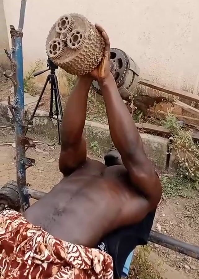 A shirtless, muscular man with a seashell necklace, wearing a brown and white patterned skirt, lifts a homemade weight. The weight is constructed from what appears to be multiple gears and a textured material. He is lying on a makeshift weight bench in an outdoor setting. There is a camera on a tripod visible in the background, along with other equipment and vegetation. The man lifts the weight upwards, then sits up and puts it down.