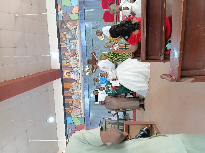 A wedding party poses for a photo beneath a crucifix. The bride is in a white dress. Attendees are dressed in various colors. A mural is visible on the wall behind the group. A woman takes a picture with her phone. Part of a church pew is visible on the right. A person holds a microphone in the foreground. The image is taken inside a church, and the perspective is slightly tilted.