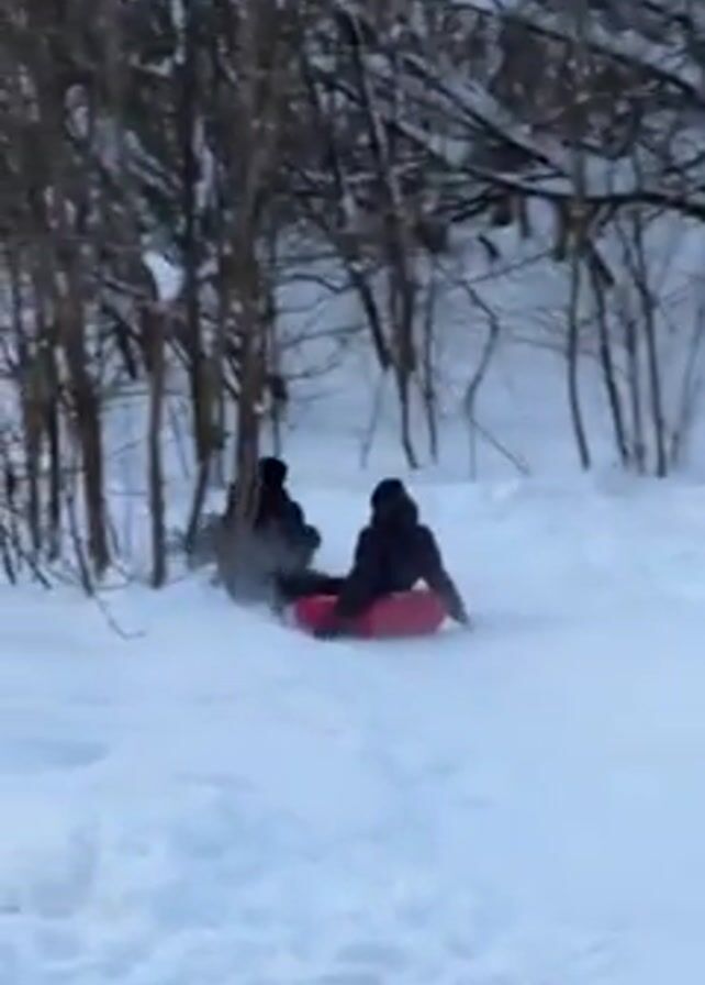 Two individuals are sledding down a snow-covered hill, weaving through a dense collection of bare trees and bushes. The person in front is on a red sled, while the person behind is on a blue one. They're bundled in dark clothing, likely for warmth against the cold. They navigate the snowy terrain, their sleds winding around the trees as they descend.