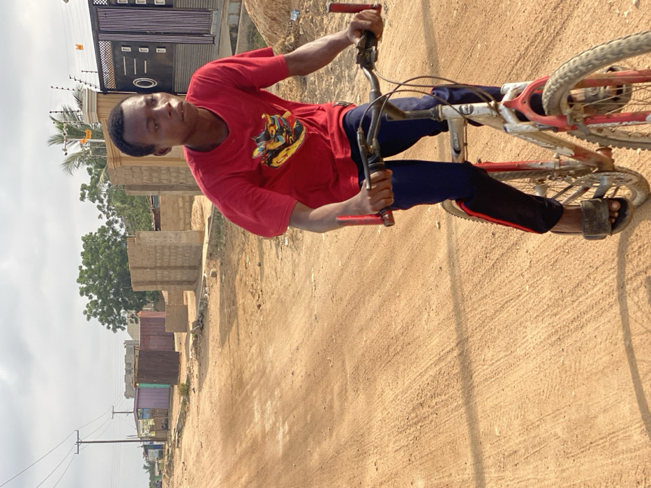 - "A young male is depicted riding a bicycle on an unpaved, reddish-brown dirt road in Joma, Ghana, under a clear sky" by FM-IRJUp1, licensed under CC BY 4.0