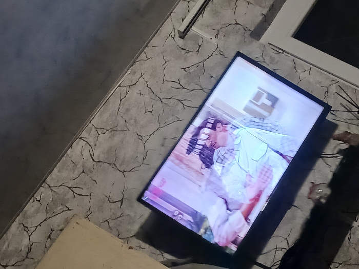 The image depicts an indoor domestic setting in the city of Trakiya, Bulgaria, captured from a slightly elevated and tilted perspective. A black-framed flat-screen television is centrally positioned, displaying a close-up image or video of two individuals. The screen shows a male figure with dark hair, wearing a light-colored, possibly checkered, long-sleeved shirt, embracing a female figure in a light-colored garment. Their faces are close, suggesting intimacy. The television is situated against a wall covered with light-toned wallpaper featuring a distinctive dark, irregular, crack-like pattern. An adjacent wall section, visible to the upper left, is plain dark grey. In the upper right corner, a segment of a white window frame is present. A light, rectangular object, possibly a piece of furniture, is partially visible at the bottom left, positioned beneath the television. Dark shadows and faint, indistinct objects are visible to the right of the television.