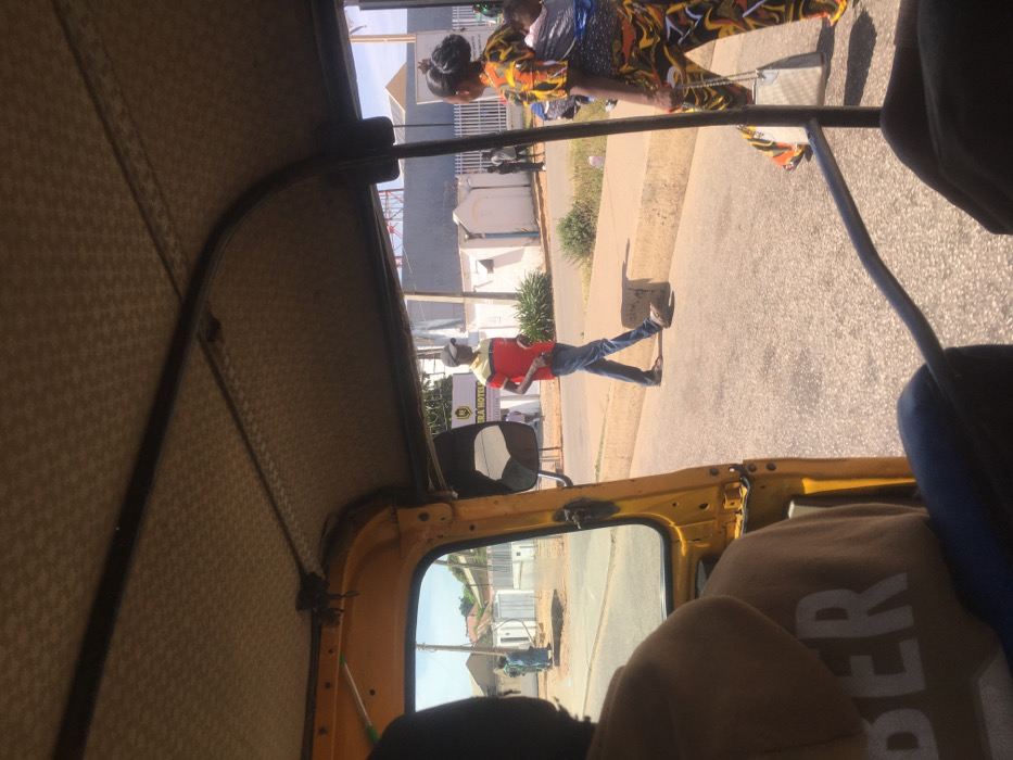 The image depicts an outdoor street scene in Jos, Nigeria, viewed from inside a yellow tricycle