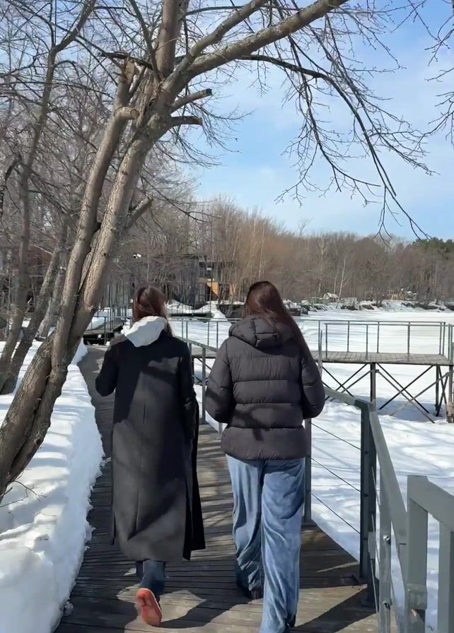 Two women are walking side by side on a wooden boardwalk during the daytime. The ground is covered in snow. The woman on the left is wearing a long, dark coat with a hood peeking out, dark pants, and red shoes, and she occasionally adjusts her hair. The woman on the right is wearing a black puffer jacket, blue pants, and black shoes. They are walking away from the camera towards a frozen lake with docks. Bare trees line the path and background, and there are some buildings visible in the distance. The sky is blue with some clouds. The scene appears to be calm and quiet.