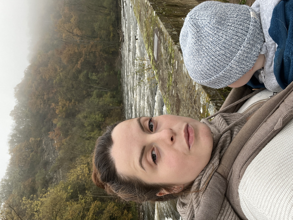 An adult female, estimated to be in her late 20s to early 30s, is depicted in a close-up, chest-up photograph taken in the city of Meisenheim, Germany. She has brown hair pulled back, light-colored eyes, and a neutral facial expression directed towards the camera. She wears a light-toned ribbed turtleneck under a white ribbed sweater and a brown baby carrier over these garments. An infant or toddler is secured within the carrier, partially visible on the right side of the frame. The child wears a light grey knitted beanie and a blue garment, with only the back of their head and upper torso visible, facing away from the camera. In the mid-ground, a moss and lichen-covered stone wall or embankment, containing metallic-looking inlays, runs horizontally behind the individuals. Beyond this wall, a river flows from left to right, exhibiting numerous ripples and white water, indicative of a rapid current. Visible debris, possibly logs or branches, is present in the river. The background features a steep, tree-covered hillside on the opposite bank of the river. The trees display varied autumn foliage, including shades of green, yellow, and orange-brown. Patches of exposed, stratified grey rock are visible on the hillside. The upper portion of the background and sky is obscured by a uniform haze or mist.