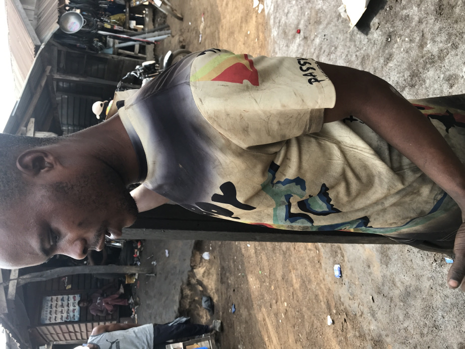 The image depicts a street scene in Oba-Ile, Nigeria, featuring a dark-skinned male in the foreground, facing right with his head turned slightly left, his mouth partially open