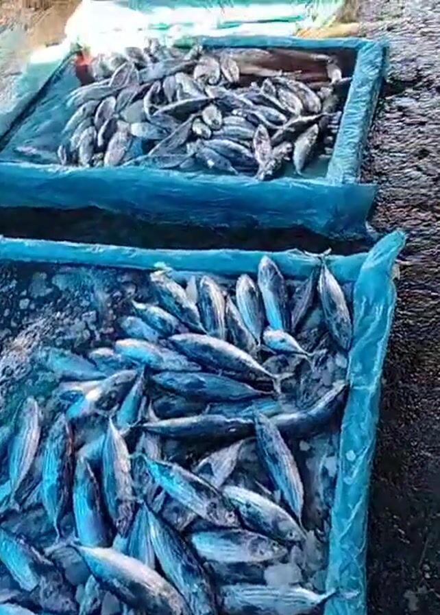 fish market with several rectangular blue containers filled with fish. The containers are arranged in a row on a wet, possibly concrete floor. The fish are silvery in color and appear to be arranged on top of ice. In the background, there are structures suggesting a market setting, with people moving around. The lighting appears to be natural, and the overall atmosphere suggests a bustling marketplace.