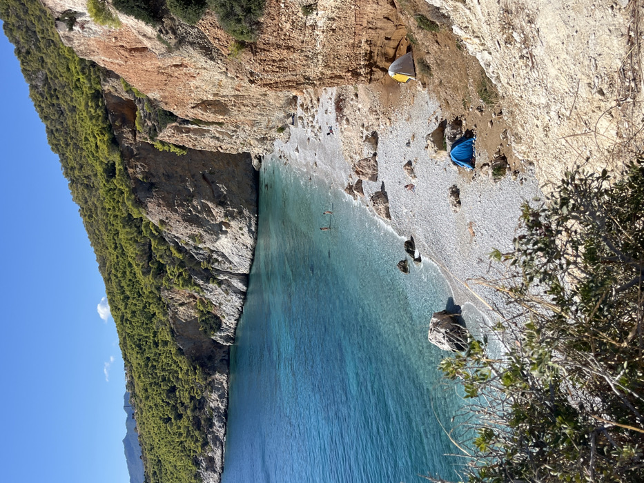 This image depicts a secluded pebble beach and a cove in Skala, Greece, viewed from an elevated, arid, shrub-covered vantage point under a clear blue sky. The water is clear, ranging from light turquoise in the shallows to deeper blue further offshore, with visible pebbles on the seabed. The cove is bordered by steep cliffs; those on the left are lighter grey and covered with dense green forest extending up the hillside, while the cliffs on the right are prominently reddish-brown with visible horizontal strata. On the light grey pebble beach, two small dome tents are pitched. A yellow and white tent is located towards the right, nestled against the base of the reddish-brown cliff. A blue tent is situated on a slightly elevated area of dry earth further left, closer to the water's edge. Four individuals are present on the beach: two are standing in the clear, shallow water in the center-left of the beach area, and two others are lying or sitting on the pebbles of the beach, one to the left and another to the right, closer to the yellow tent. Sparse, dry vegetation is visible in the immediate foreground, indicative of the high viewpoint.