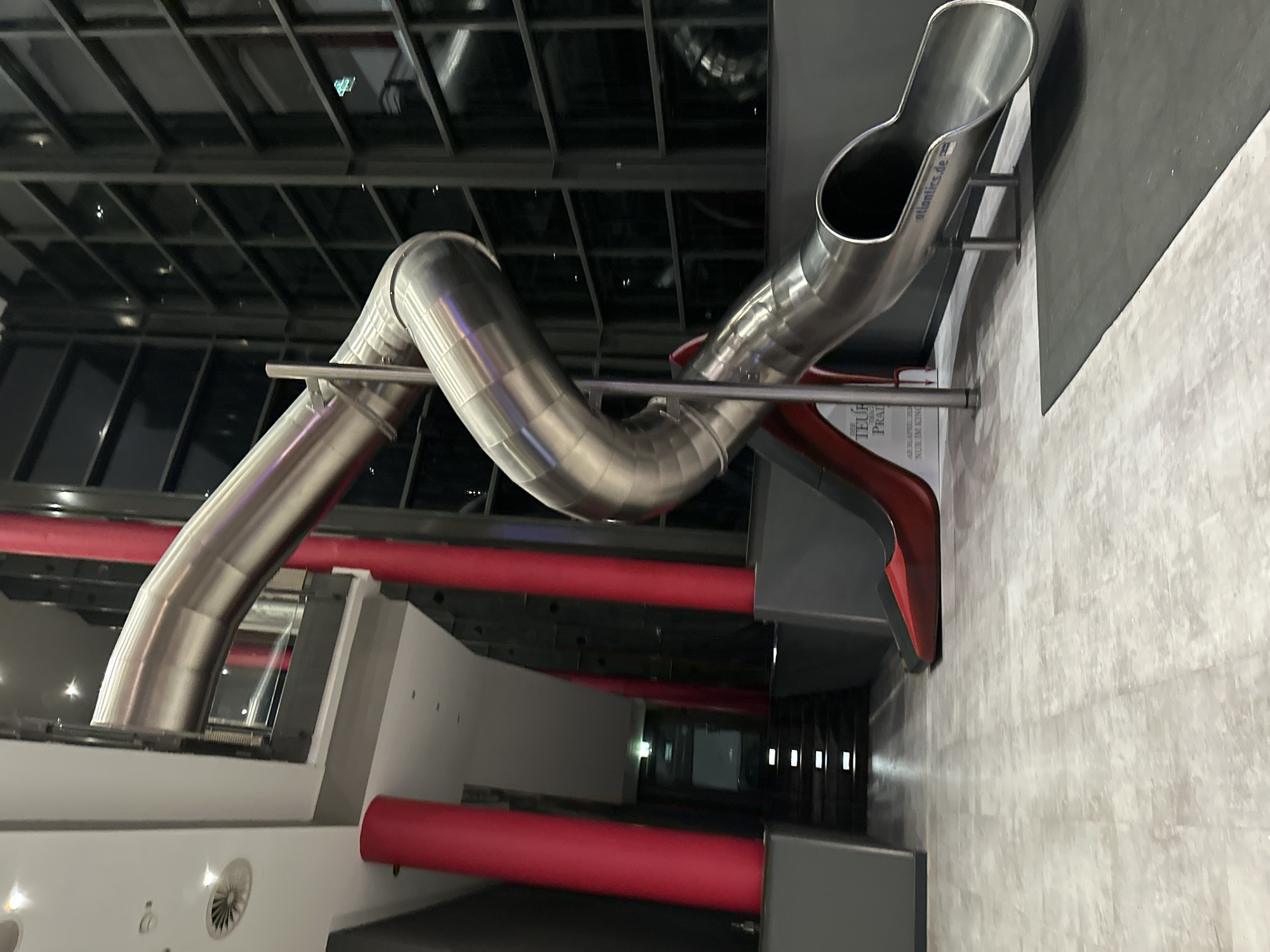 This image depicts a brightly lit, modern interior space, identified as the Atlantis Hotel in Hamburg, Germany. The central subject is a large, multi-segmented, polished stainless steel slide, which descends from an upper level on the left to the ground floor on the right. The slide features several curves and is supported by metallic vertical poles. At the base of the slide, near its exit, a prominent red high-heel shoe sculpture is integrated into the structure, acting as a decorative and structural element. The text "atlantis.de" is visible in white lettering on the lower section of the slide near its exit. A dark, rectangular anti-slip mat is positioned directly beneath the slide's terminus on the light-colored, patterned floor tiles. The environment includes several large, cylindrical pillars, painted a vibrant red, spaced throughout the area. To the right, a multi-story wall features large, dark-framed window panels, reflecting ambient light. The ceiling is white with recessed lighting fixtures and circular air vents. In the background to the left, a dimly lit stairwell with light-colored steps and dark risers is visible, leading to an upper floor. No individuals are present or interacting with the slide or its surroundings.