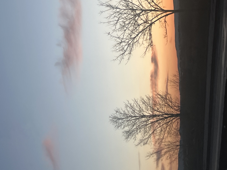 The image displays a twilight outdoor scene located on the outskirts of Sofia, Bulgaria, overlooking distant landforms. The sky dominates the upper portion, featuring a gradient from light blue at the zenith to vibrant orange and yellow hues near the horizon. Several elongated, wispy, pinkish-orange clouds are horizontally dispersed across the sky. In the midground, the bare silhouettes of deciduous trees are prominently cast against the colorful sky; a large, full-crowned tree stands on the left-center, and a second, equally bare tree is on the right, with additional smaller tree and shrub silhouettes visible between them. Below the tree line, a dark, undulating horizon indicates distant hills or terrain. The immediate foreground consists of a dark, flat horizontal surface, consistent with a paved road or similar dark ground cover. No individuals, vehicles, or discernible architectural landmarks are present. The scene is static, capturing a natural landscape at dusk or dawn.
