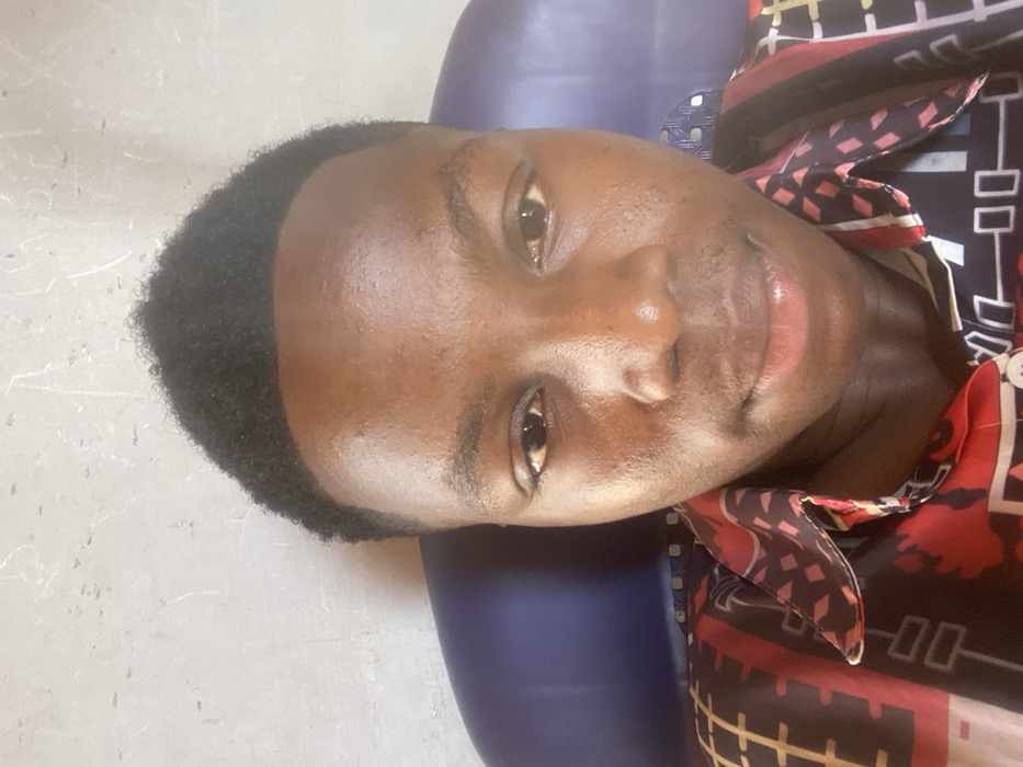 The image displays a close-up portrait of a young male individual, positioned indoors in Ibadan, Nigeria