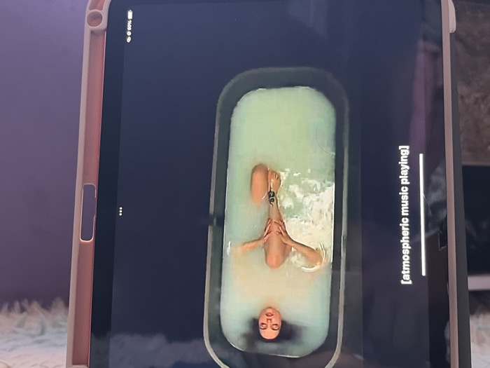 In Ogbomosho, Nigeria, an electronic tablet, enclosed in a light pink protective case, rests on a white, fluffy surface. The tablet's screen displays a video featuring a person submerged in a bathtub filled with a light green liquid. The individual's head, with dark hair, is visible at the bottom of the video frame, facing upwards. Their legs are bent, and arms are crossed over the torso. Overlayed text on the screen reads "[atmospheric music playing]". The tablet interface also shows battery and Wi-Fi status in the upper right corner, and a vertical three-dot menu icon on the left. A blurred purple surface is visible in the background behind the tablet.