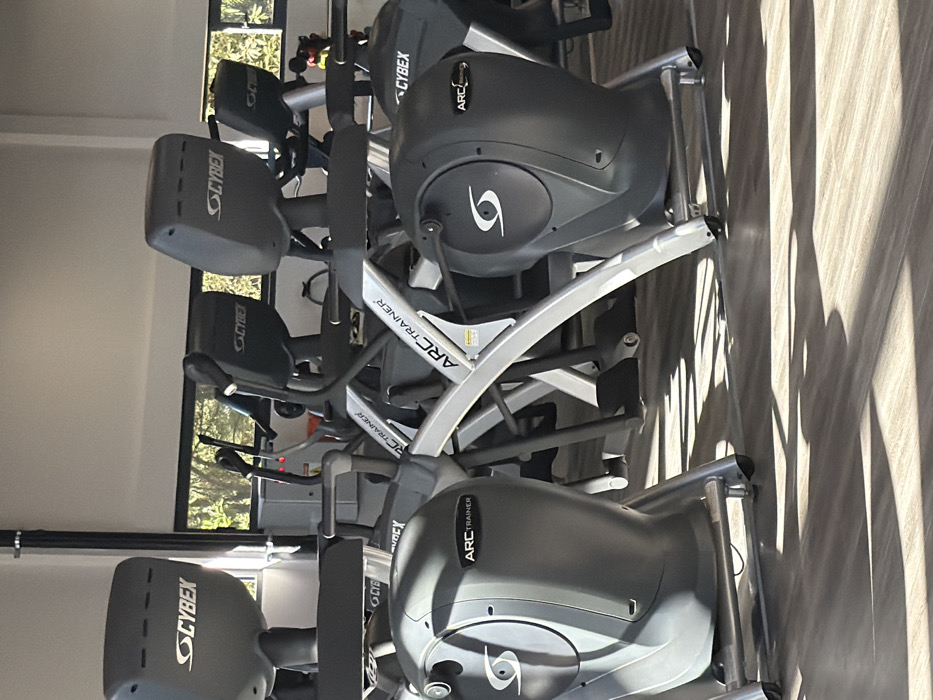 several Cybex Arc Trainers in a gym. The machines are gray with silver frames. The machines are angled towards the right side of the frame, with the rightmost machine casting shadows on the floor. Windows can be seen in the background.