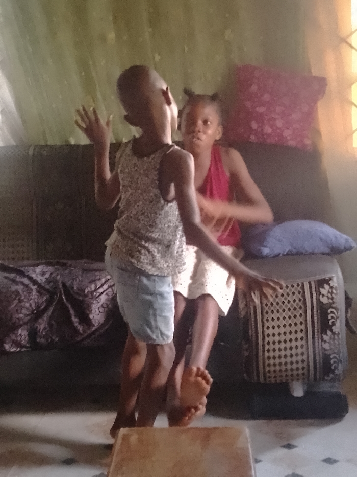 The scene depicts two individuals indoors, likely a residence, in Otokiti, Nigeria. A younger individual, appearing to be a child, stands in the foreground with their back mostly to the camera, wearing a light-colored, patterned sleeveless top and light-blue shorts. Their hands are raised, and they are in motion, possibly dancing or gesturing. Another individual, slightly older and appearing to be a youth, sits on a dark-colored sofa behind the first individual, facing generally towards the camera. This individual wears a red tank top and a light-colored, possibly white, skirt. Their hands are blurred, suggesting movement, and their mouth is slightly open. The immediate environment includes a dark-colored sofa with a patterned cover (dark purple/brown) beneath the sitting individual. On the sofa, a large reddish-pink patterned cushion and a smaller blue cushion are present. A light green curtain or fabric hangs in the background, to the left. To the right, a window with visible security bars (grille) allows natural light into the space. The floor is a light, solid color. In the immediate foreground, a blurry, light brown, rectangular object, possibly a low table or stool, is partially visible.