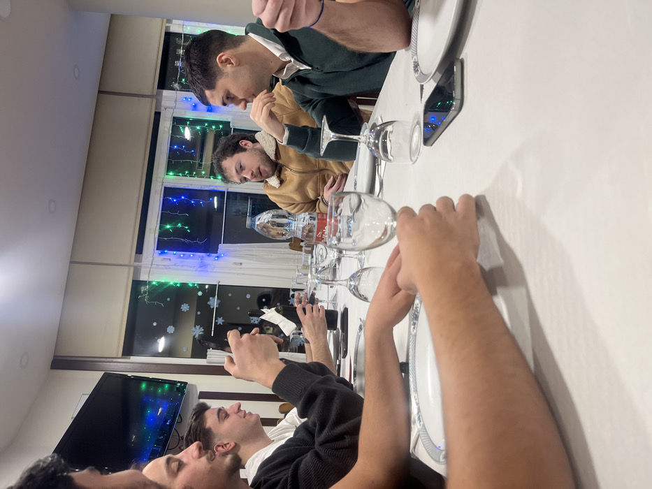 A group of people are seated at a long table covered with a white tablecloth. Plates and wine glasses are set for a meal. Some individuals are looking at their phones. Christmas lights decorate the window in the background. A television is visible in the lower left corner. A water bottle and wine bottles are also on the table.