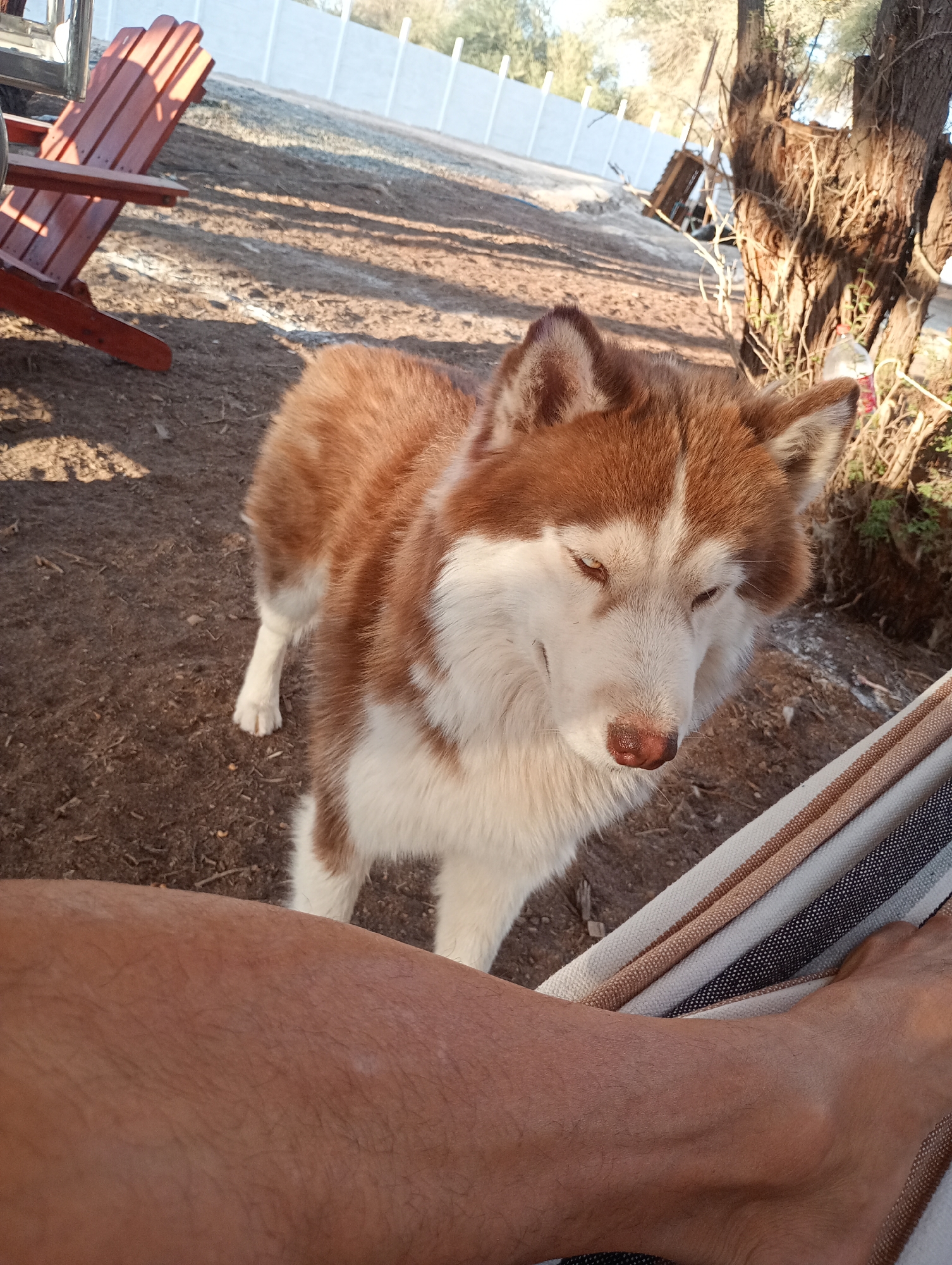A medium shot captures a brown and white husky standing on dirt. A leg and foot are in the foreground on a striped hammock. In the background, a wooden Adirondack chair is partially visible, and there are trees with a white fence in the distance. The location appears to be outdoors, potentially in a yard or garden in Pozo Almonte, Chile.