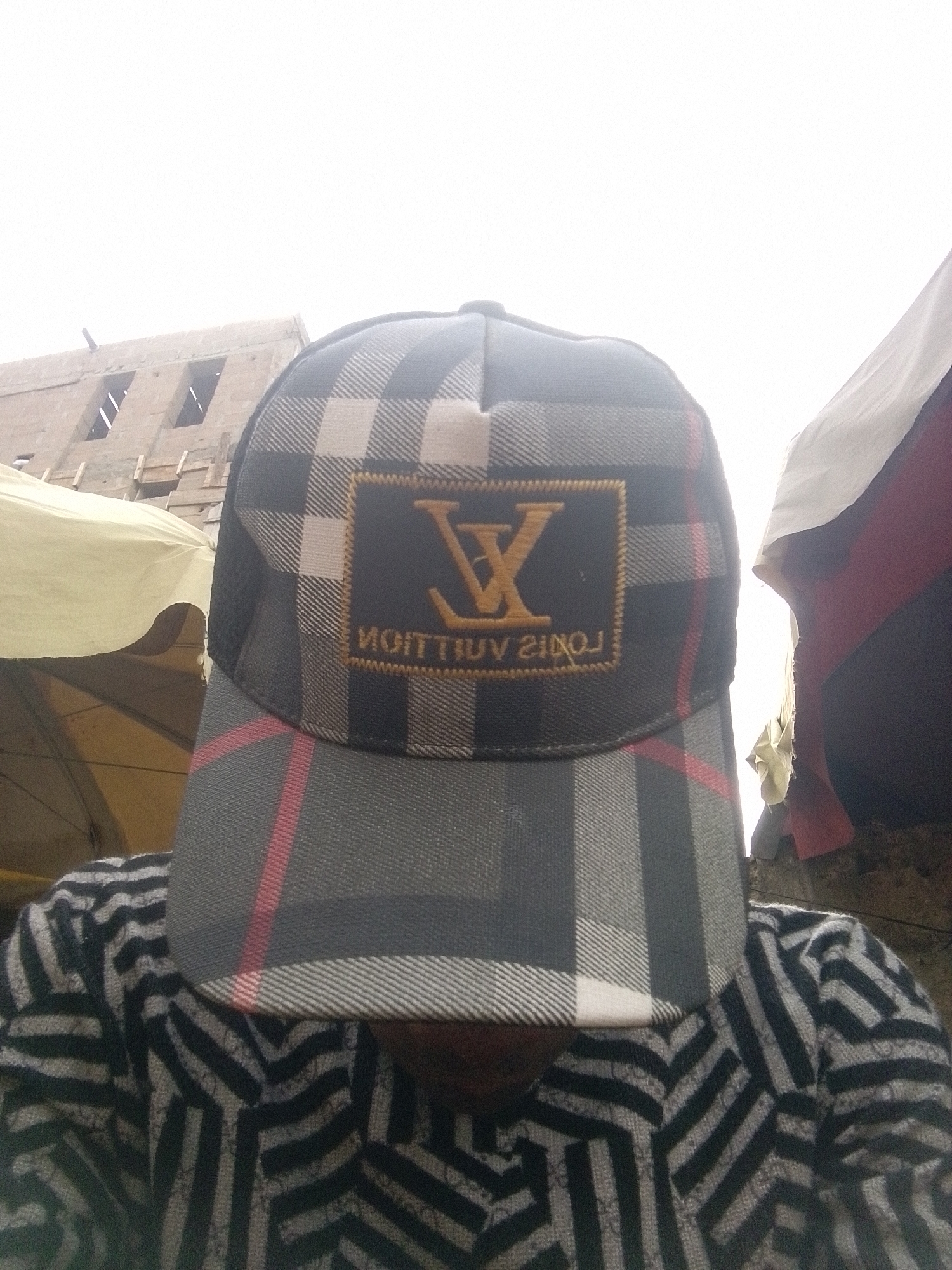 An individual is depicted in a close-up, facing the camera, with their head obscured by a baseball cap. The person is wearing a long-sleeved garment featuring a repetitive geometric pattern of interlocking black and light grey/white stripes. The baseball cap is plaid, primarily in shades of black, grey, and white, with thin red linear accents. Affixed to the front of the cap is a dark rectangular patch with gold embroidered "LV" initials above the word "NOITTIUV" (Louis Vuitton spelled in reverse). The background indicates an outdoor urban environment within Egbagu, Nigeria. To the left, a light-colored canvas or tarp structure, possibly an awning or market stall, is partially visible. In the upper background, a multi-story building constructed of concrete blocks is present, featuring multiple open window frames and visible wooden support structures, suggesting it is either under construction or in a state of disrepair. To the right, a portion of a darker fabric structure, possibly another awning, is seen. The sky is overexposed and appears bright white, indicating strong, diffuse lighting conditions. The composition suggests a self-portrait.