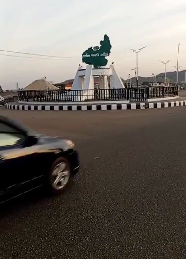 roundabout in what appears to be a town. A large, green sign on top of a white structure is in the center of the roundabout. The sign has the word "Grande" written in white letters. The roundabout is surrounded by a black and white striped border. Cars and a van drive around the roundabout. Street lights and power lines are visible in the background. The sky is overcast.
