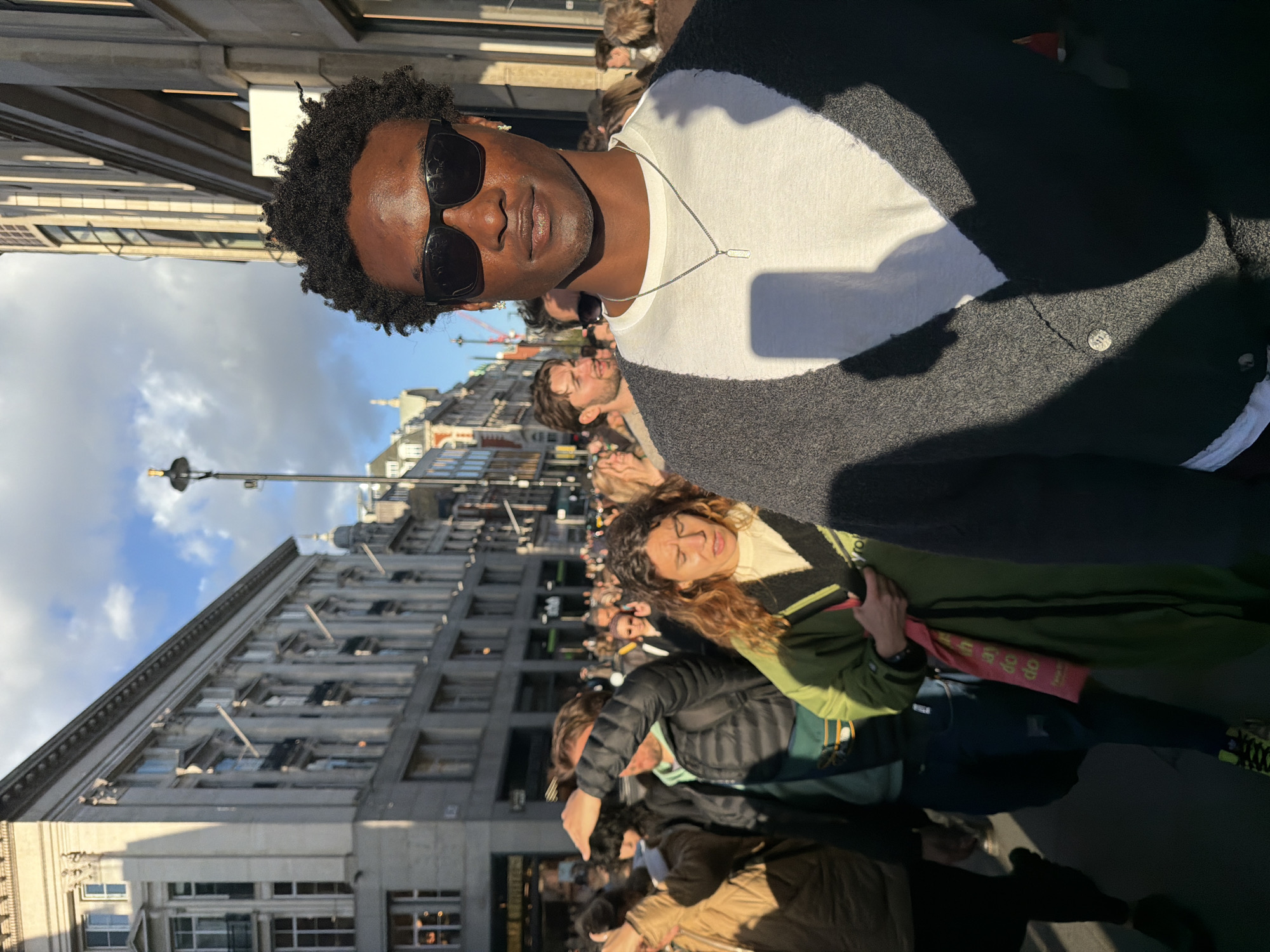 A man with dark skin and curly hair wears sunglasses, a white t-shirt, a dark cardigan, and a silver necklace, posing for a selfie in a crowded London street