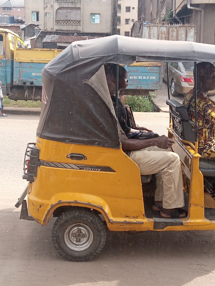 - "A yellow three-wheeled motorized vehicle, identified as a "DELUXE" model, occupies the center-right of the frame on a light-colored road" by FM-KVwpn1, licensed under CC BY 4.0