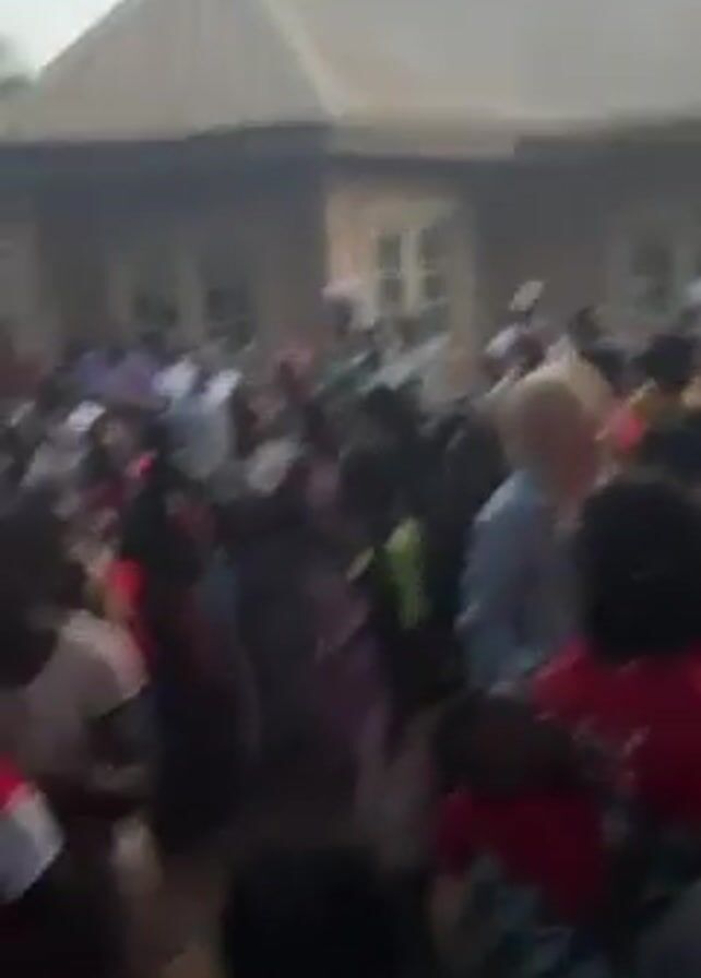 large group of people gathered outdoors, possibly at a party or celebration. The crowd is dense, and people are moving around, dancing, and generally enjoying themselves. There appear to be residential buildings and palm trees in the background. The video is taken from within the crowd, so the view is somewhat obstructed. One individual in the crowd can be seen wearing a gray top and pink pants, with their long braided hair visible. The overall atmosphere seems lively and festive.