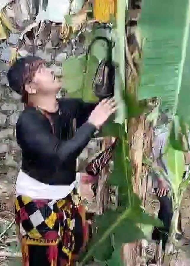 A person dressed in a traditional costume is seen tearing off leaves from a banana tree. They wear a black long-sleeved shirt with a graphic design on the back, a white cloth around their waist, and patterned pants. The person also wears a head wrap. After tearing off the leaves, they turn around, revealing a large, feathered headdress. In the background, several people, including a woman holding a small child, watch. The setting appears to be an outdoor area with a stone wall and greenery.