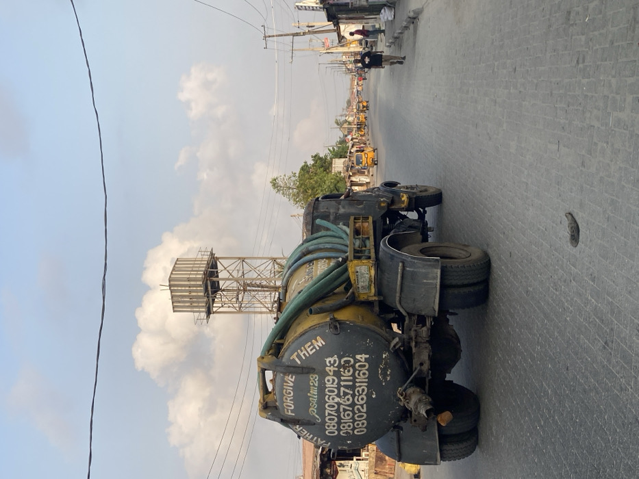 A yellow sewage truck parked on a paved road, displaying "Father Forgive Them" and phone numbers. It's facing away from the camera. The road extends into the distance with various vehicles, including yellow tricycles. A person walks along the street. Overhead power lines stretch above. A metal structure resembling a water tower stands nearby, under a cloudy sky.